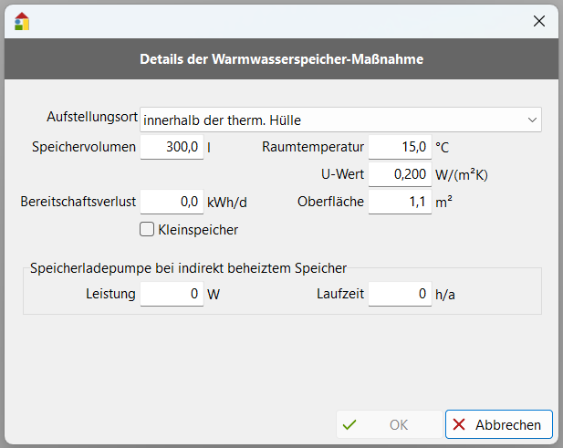 Volumen: Wird ein Volumen des Speichers angegeben, so werden die Oberfläche, der U-Wert und die Lufttemperatur automatisch eingetragen.