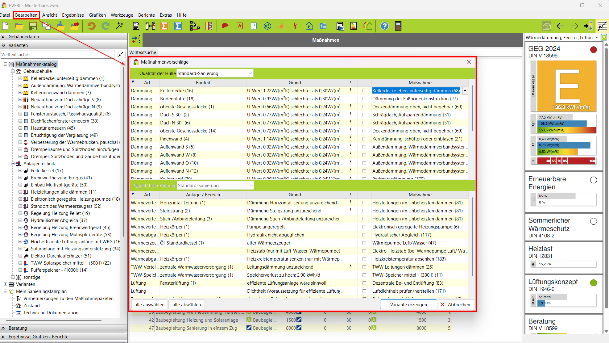 Sie können aus einer Maßnahmenliste die gewünschten Maßnahmen wählen. EVEBI legt automatisch eine neue Variante an und erfasst in dieser Variante die Maßnahmen, die Sie gewählt haben.