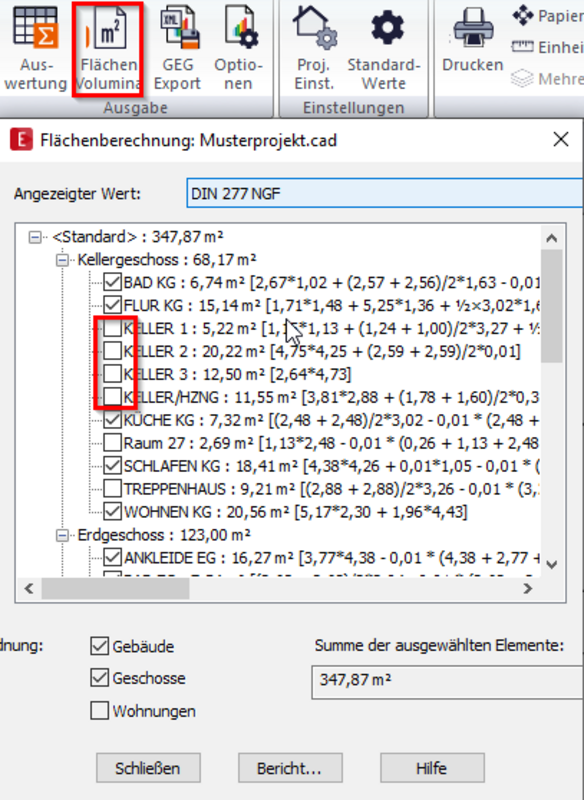 GEG-Modus öffnen: In der Kopfleiste FLÄCHEN UND VOLUMINA anwählen. --> In dem sich öffnenden Dialogfenster den Haken bei den Räumen entfernen, die nicht mit in die Auswertung eingehen sollen.