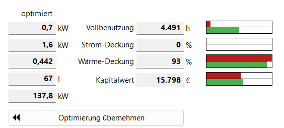 Wärmedeckung: es kann auch Ziel der Auslegung sein, eine hohe wärmeseitige Auslastung zu erreichen. Bei Mikro-KWK kann dies bis zu einer Monovalenz (100%) reichen. Ein gewünschter Deckungsanteil wird vorgegeben (z.B. 80%) und so lange simuliert, bis diese Auslastung erreicht wird. Ist sie nicht erreichbar (z.B. wegen der Betriebszeiten), wird das entsprechend signalisiert bzw. bleibt beim Maximum stehen. Hinweis: DIN V 18599-9 geht als Standardwert von 80% aus.