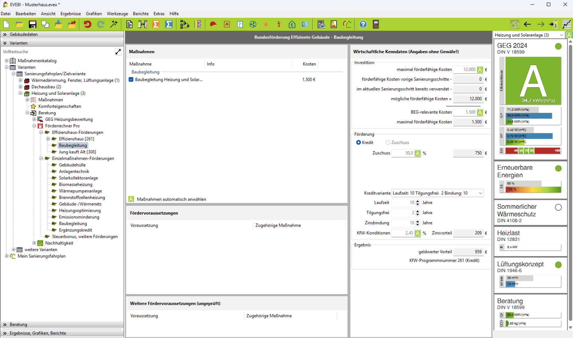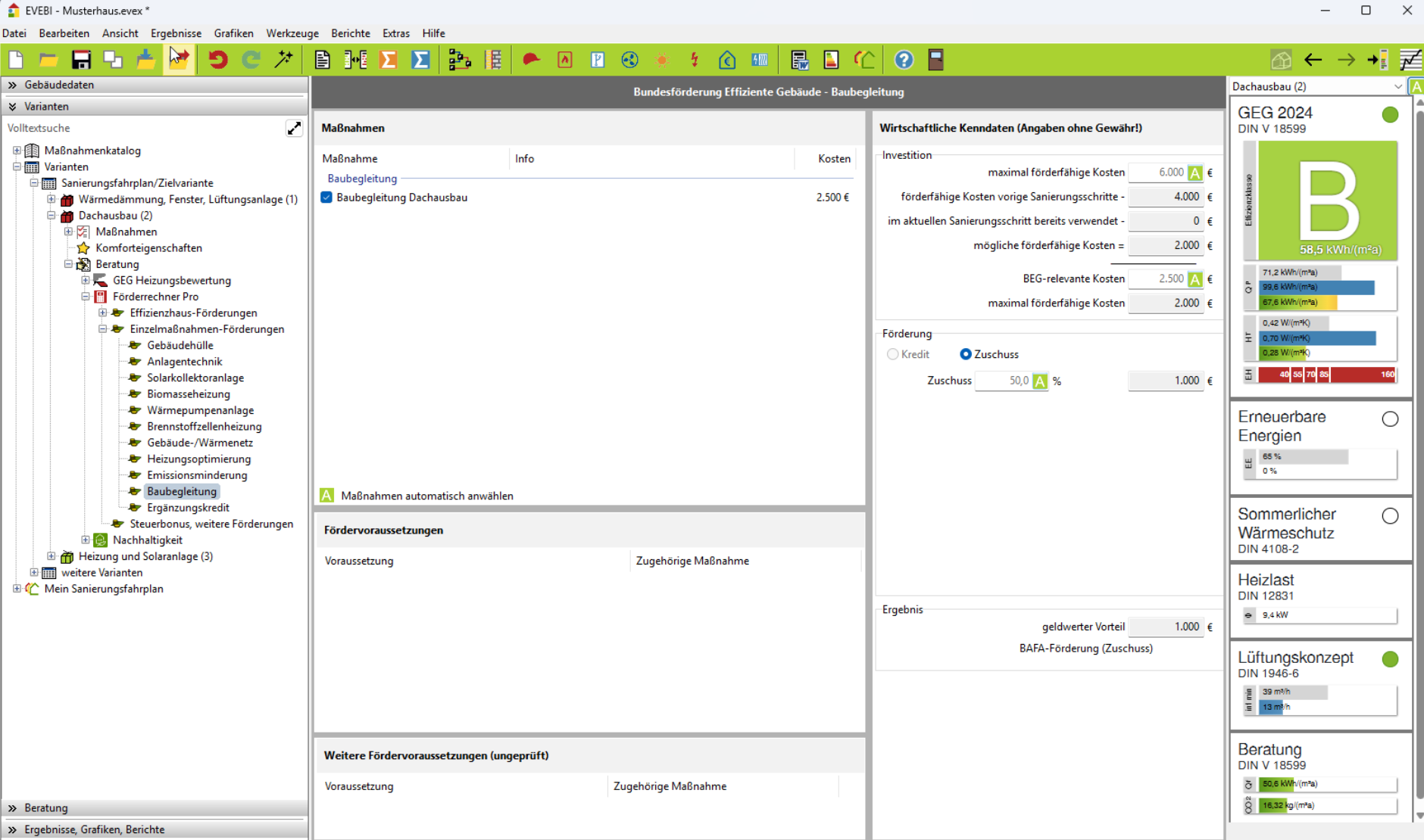 Wählen Sie im Navigationsbereich die gewünschte Variante aus und klicken Sie innerhalb der Variante auf den Eintrag Förderrechner. Sie sehen jetzt, ob die Baubegleitung innerhalb der Effizienzhaus-Förderung oder der Einzelmaßnahmen-Förderung zugeordnet wurde.