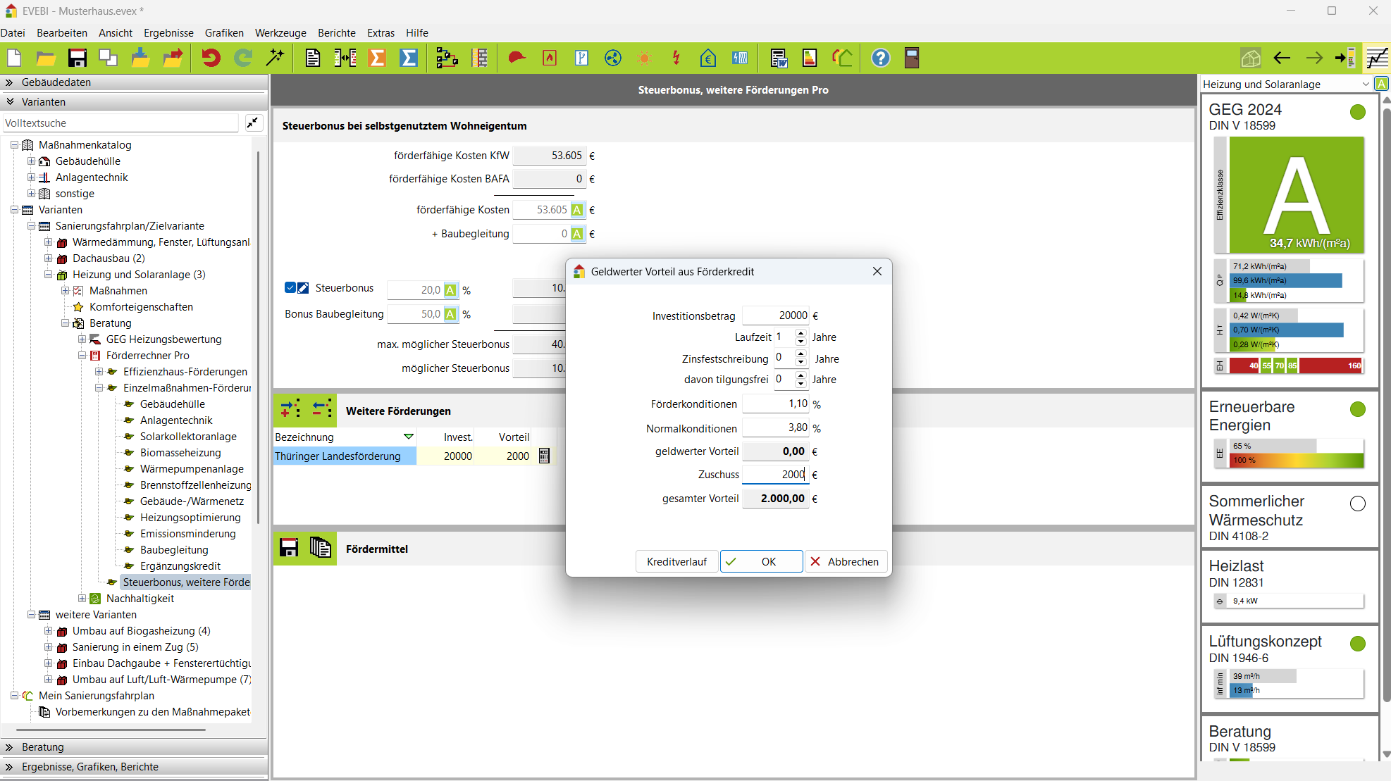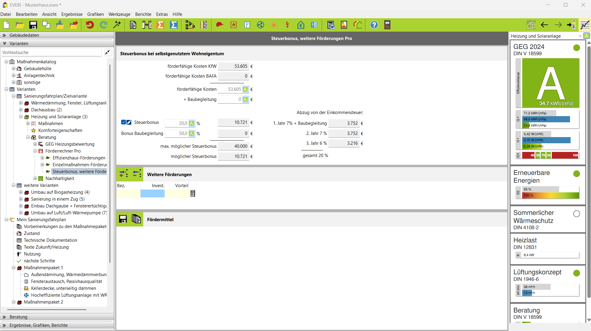 Im Förderdialog können Sie den Steuerbonus anwählen oder ein eigenes Förderprogramm angeben. Damit ist es u.a. möglich, regionale bzw. individuelle Förderungen zu berücksichtigen.