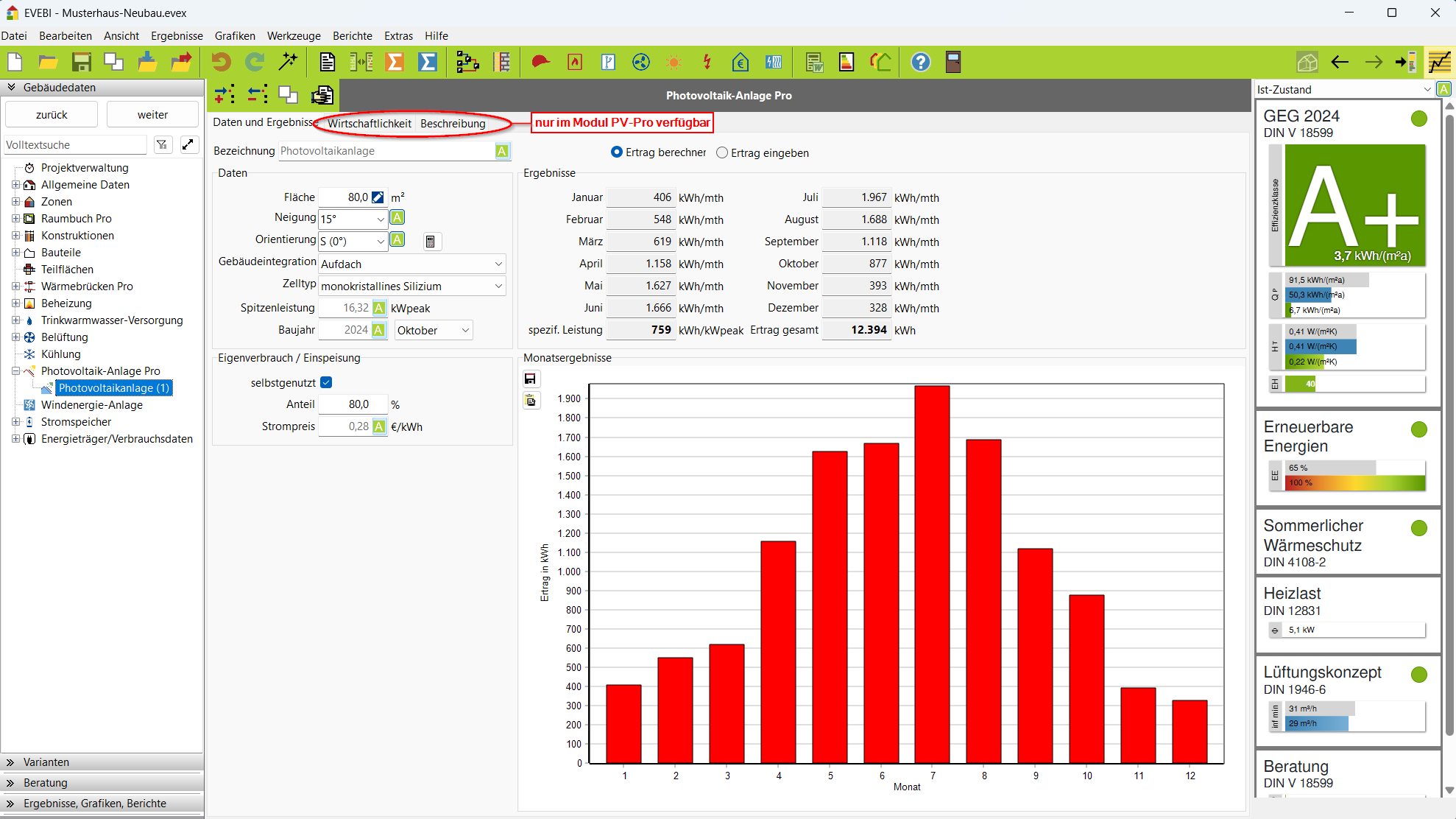 Eigenverbrauch / Einspeisung: Für die individuelle Energieberatung kann abschließend noch bestimmt werden, wie viel Prozent des Stromertrags im Gebäude selbst genutzt werden; der restliche Ertrag wird eingespeist (mit der entsprechenden Einspeise-Vergütung in Abhängigkeit des Baujahres der Anlage, siehe auch PV Pro Wirtschaftlichkeit).