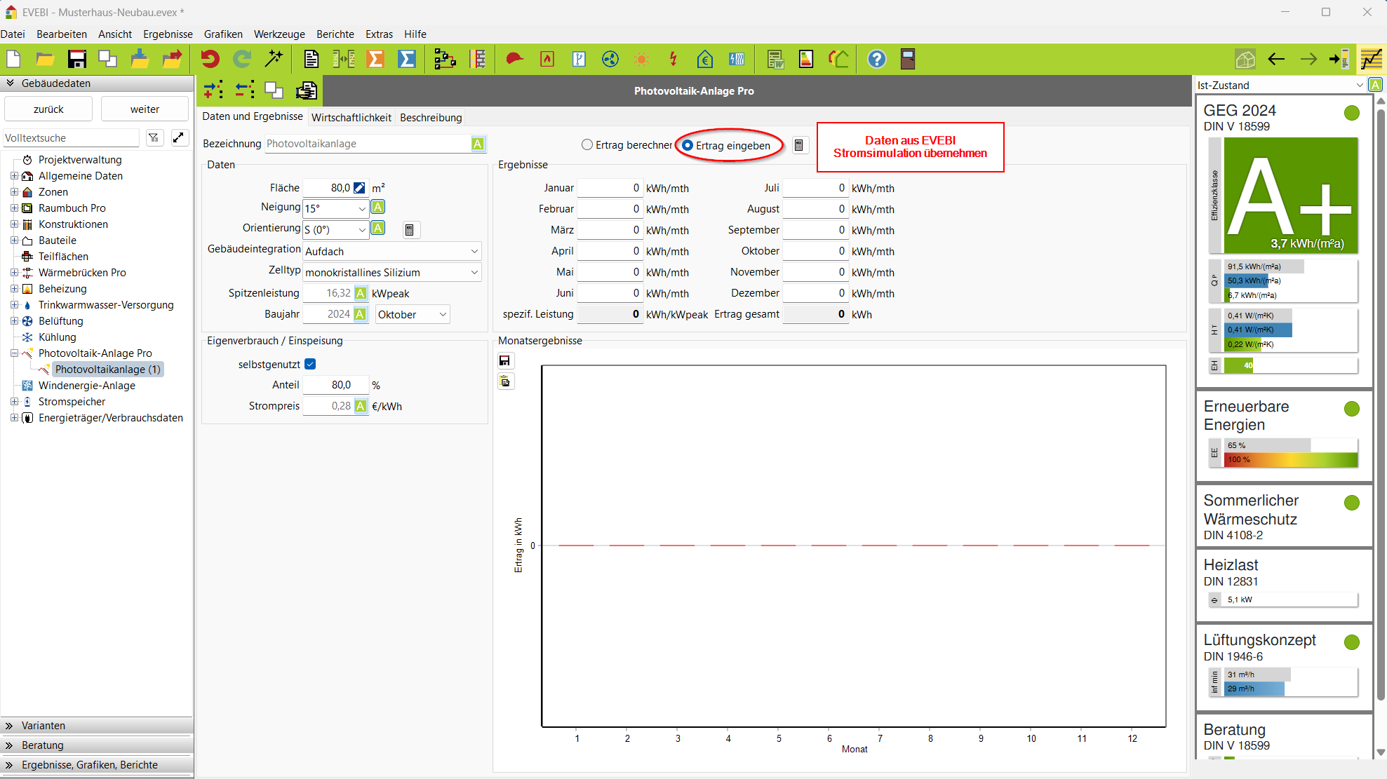 Mit Hilfe der Schaltfläche Eintrag eingeben (rechts über der Ertragsgrafik Monatsergebnisse) besteht zudem die Möglichkeit, für die individuelle Energieberatung eigene Monatserträge der Photovoltaik-Anlage einzugeben.