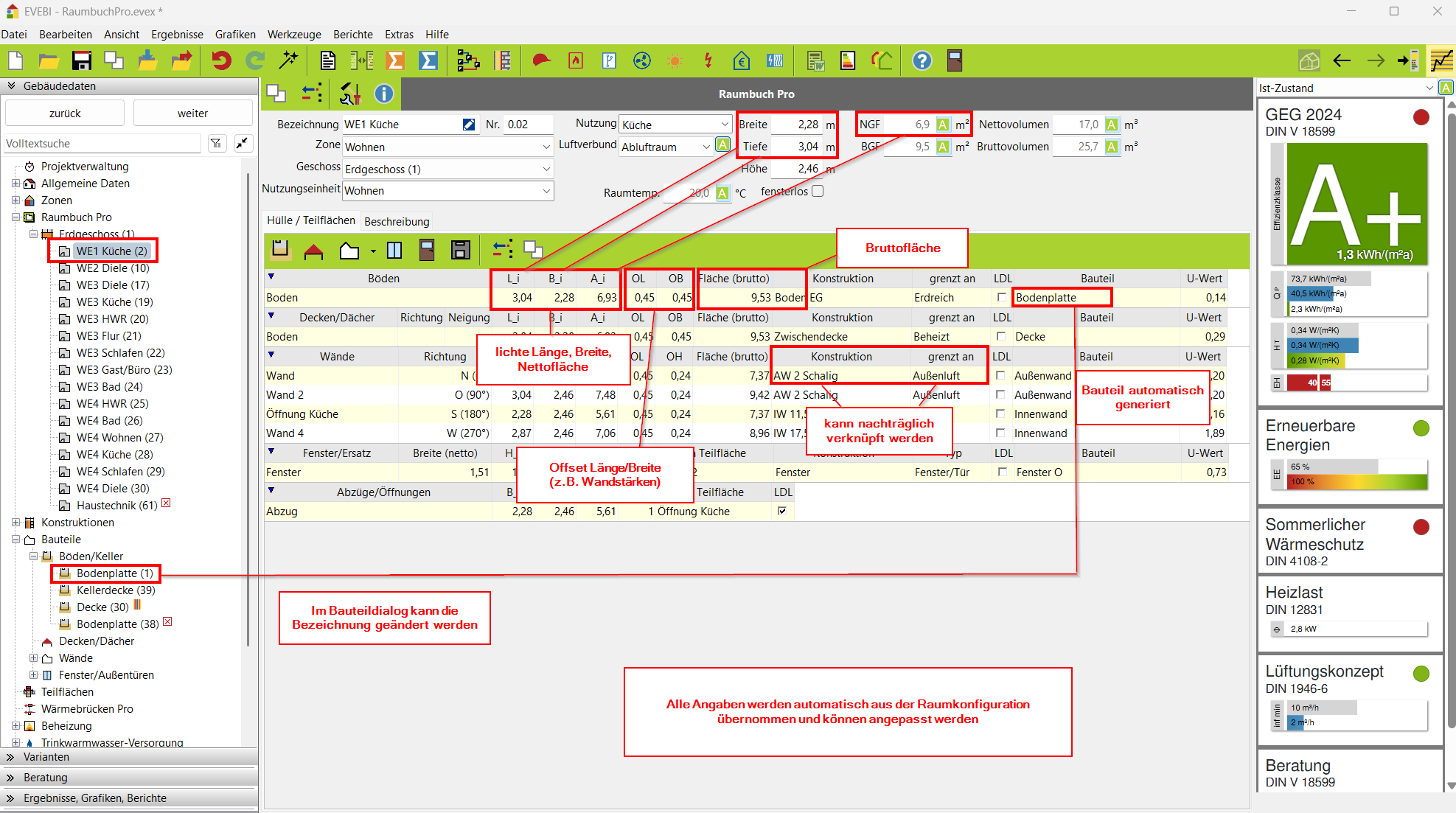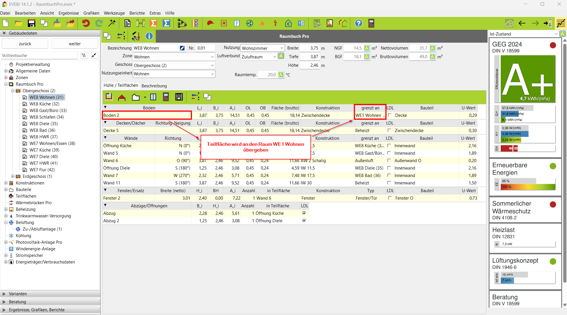 Weitere Erläuterungen zum Zusammenhang zwischen dem Raumbuch und den Bauteilen finden Sie unter: Zusammenhang zwischen dem Raumbuch Pro und den Bauteilen