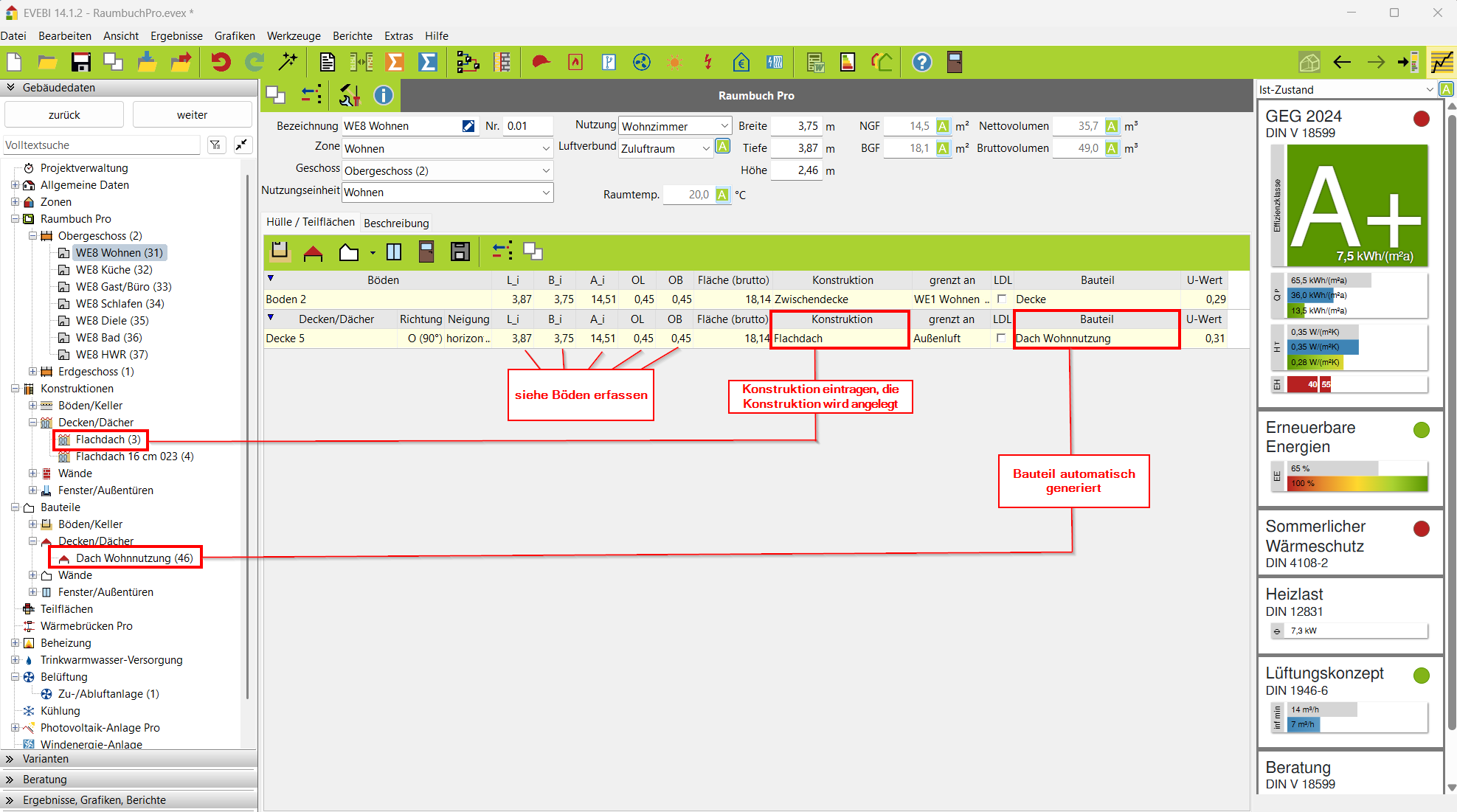 Weitere Erläuterungen zum Zusammenhang zwischen dem Raumbuch und den Bauteilen finden Sie unter: Zusammenhang zwischen dem Raumbuch Pro und den Bauteilen