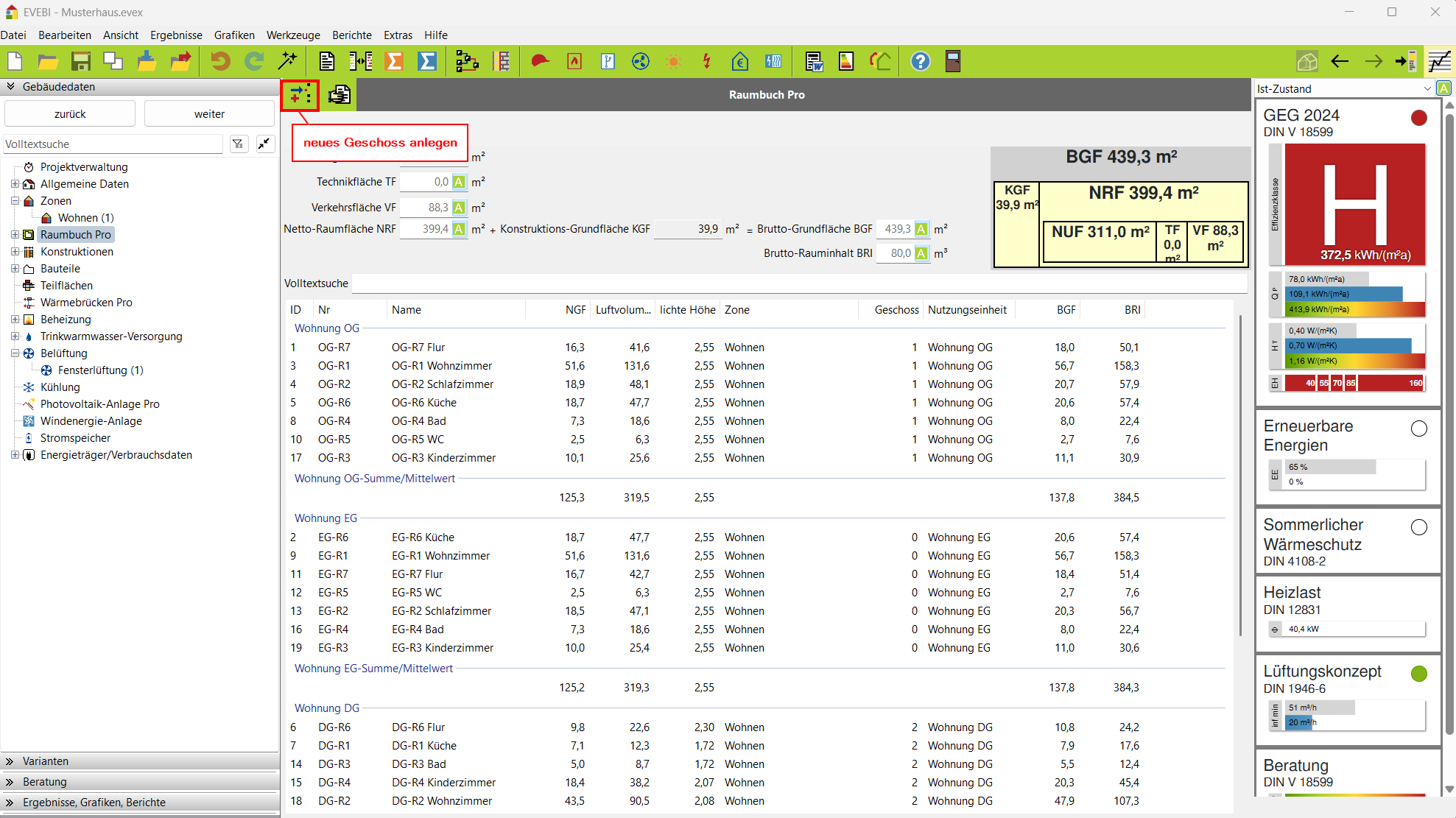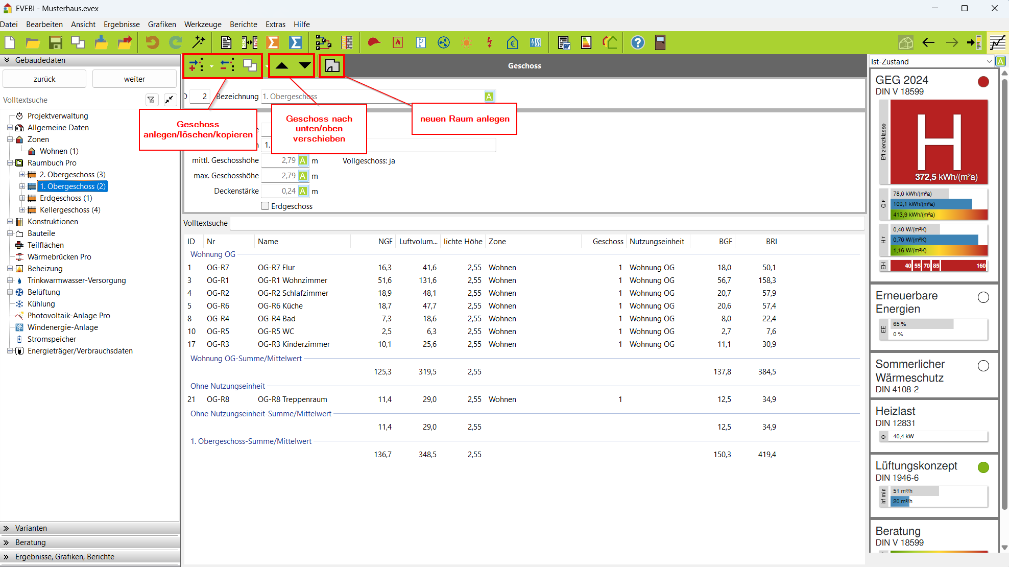 - Die Räume werden geschossweise erfasst.