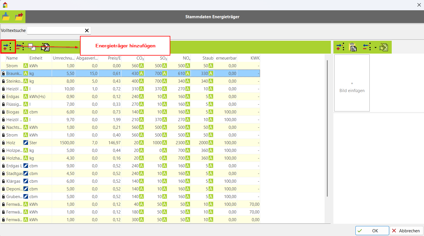 - Wählen Sie im Menü Extras > Datenbankpflege > Energieträger. Die Datenbank wird geöffnet.