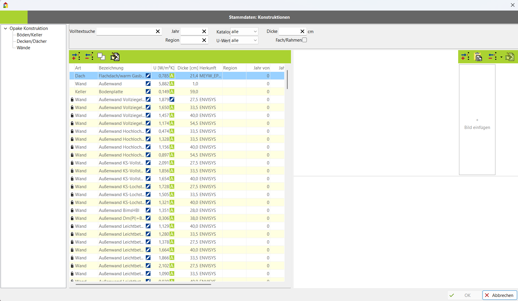 Bei der Erfassung eines Gebäudes können Sie eine Konstruktion über die Zuordnung von Baustoffen erfassen oder auf bereits vorhandene Konstruktionen dieser Datenbank zugreifen.