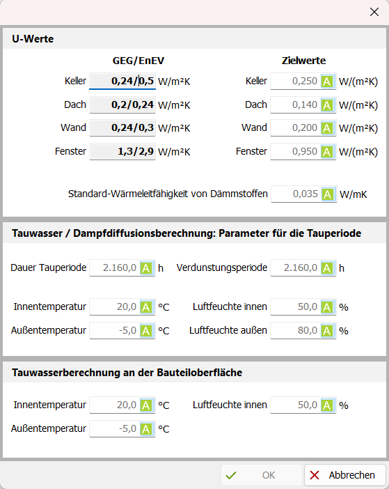 U-Werte: Hier können Sie Zielwerte für die U-Werte eintragen. Diese Zielwerte werden in verschiedenen Berichten ausgegeben.