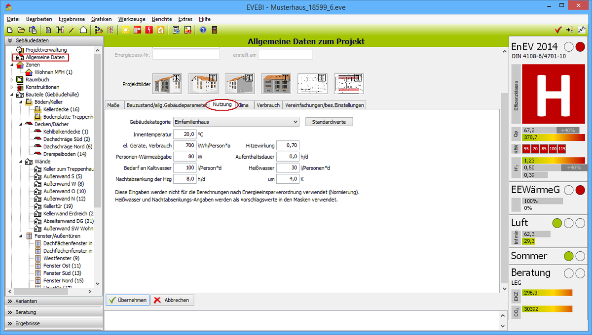 - Wählen Sie das Register Nutzung. Die Daten der Nutzung werden aus der eingestellten Gebäudekategorie übernommen.