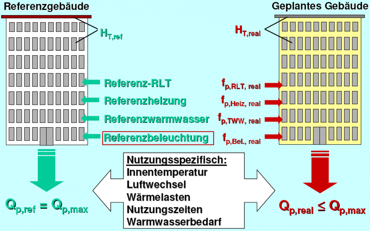 | Sonnenschutzvorrichtung | Für das Referenzgebäude ist die tatsächliche Sonnenschutzvorrichtung des zu errichtenden Gebäudes anzunehmen; sie ergibt sich ggf. aus den Anforderungen zum sommerlichen Wärmeschutz nach §14 GEG | |