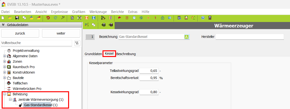 - TECHNIK: Wählen Sie als Technik einen Kessel (Brennwert, Niedertemperatur, Standardkessel).