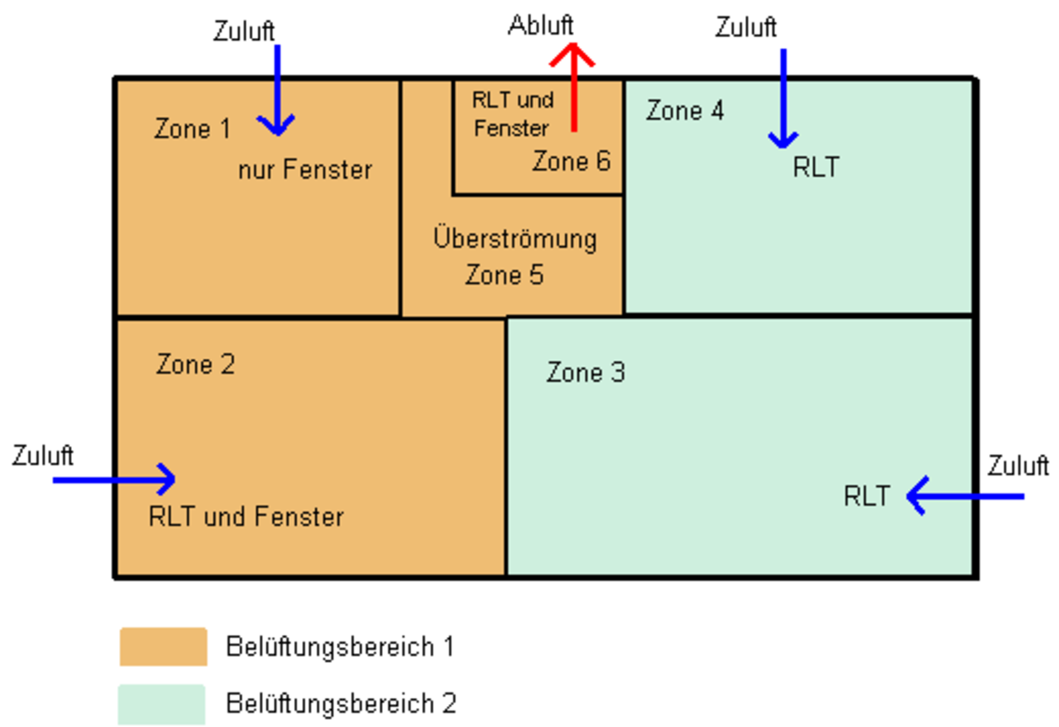 • Luftverbund: Besteht zwischen mehreren Zonen ein Luftverbund (Zuluftzone, Überströmzone, Abluftzone), so ist es sinnvoll, diese Zonen zu einem Belüftungsbereich zusammen zu fassen.