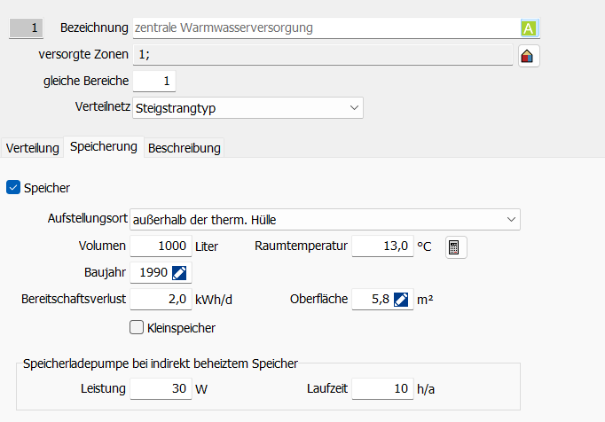 - Aufstellungsort: Wählen Sie die Aufstellung des Speichers aus. Die Umgebungstemperatur wird entsprechend (DIN V 18599-8, Tabelle 6) berücksichtigt.