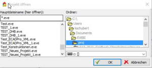 Über das Menü DATEI --> EVEBI 8 Projekt öffnen erscheint das aus älteren EVEBI-Versionen bekannte Fenster zum öffnen eine Projektes über die .eve-Datei aus dem Projektordner.