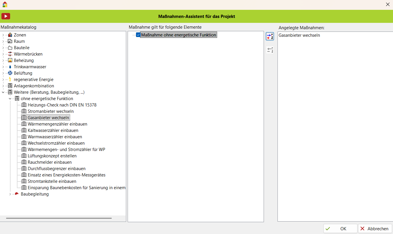 - Wählen Sie im Bereich Maßnahmen anwenden den Eintrag Maßnahme ohne energetische Funktion.