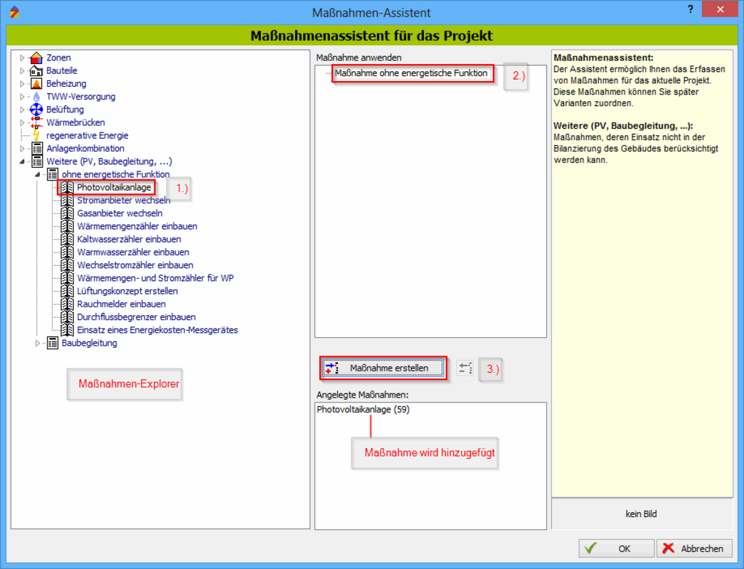 - Wählen Sie im Bereich Maßnahmen anwenden den Eintrag Maßnahme ohne energetische Funktion.