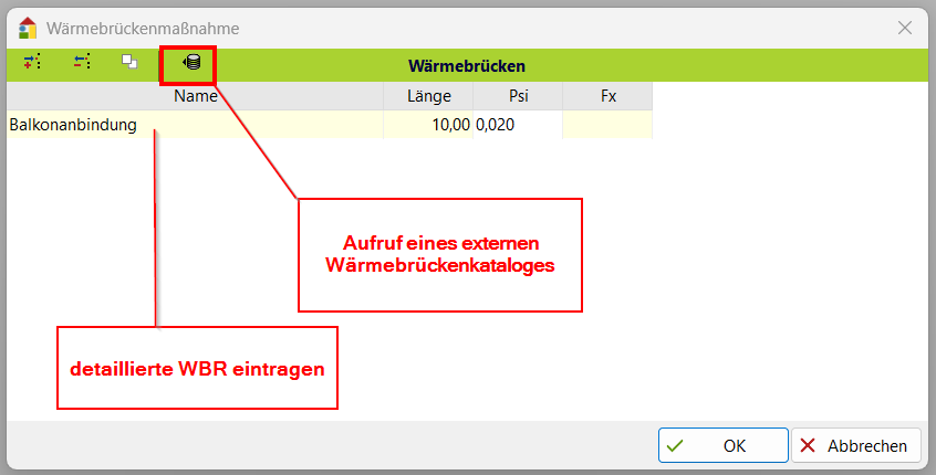 Dialog der Maßnahme Wärmebrücke detailliert erfassen