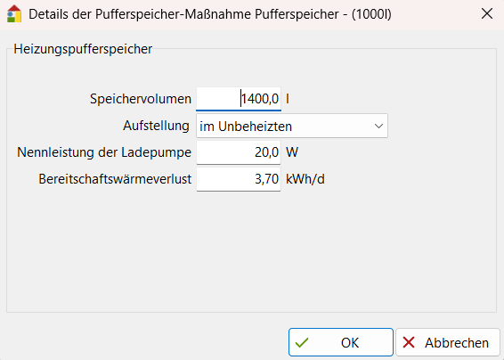 - Kosten: Die Kosten beziehen sich auf einen Heizungspufferspeicher. Sind mehrere Heizbereiche ausgewählt worden oder handelt es sich um Multibereiche, so werden die Kosten mit der Anzahl der Bereiche multipliziert.