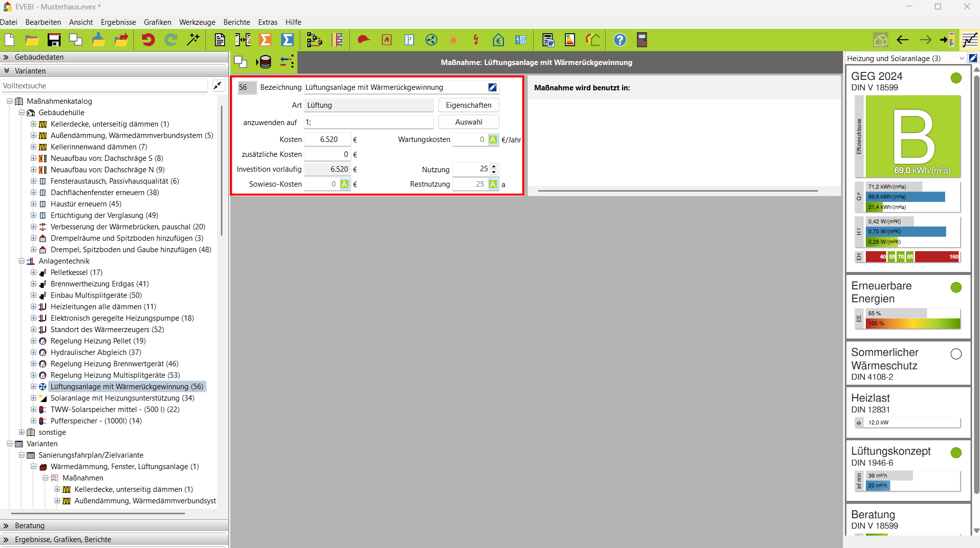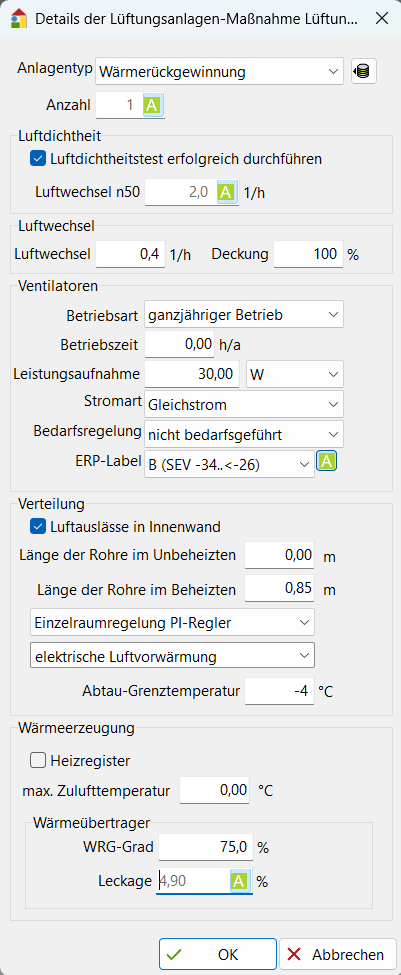 Dialog der Maßnahme Lüftungsanlage mit Wärmerückgewinnung