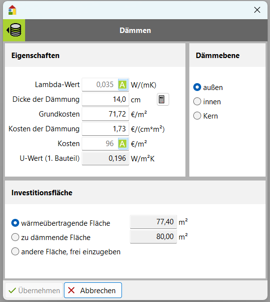 Hier werden neben der Wärmeleitfähigkeit auch alle anderen Eigenschaften einer Dämm-Maßnahme gebraucht. Dazu ist neben dem zu dämmenden Bauteil auch eine Dämm-Maßnahme aus der Maßnahmendatenbank zu wählen.