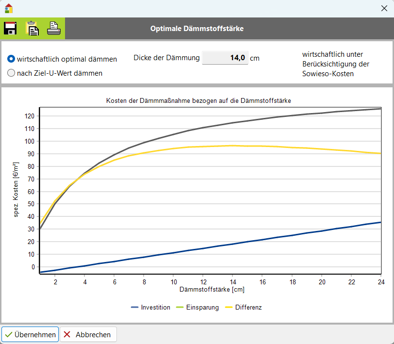 Sie können eine Dämm-Maßnahme einfügen, deren Dämmdicke der wirtschaftlich optimalen Dämmdicke entspricht.