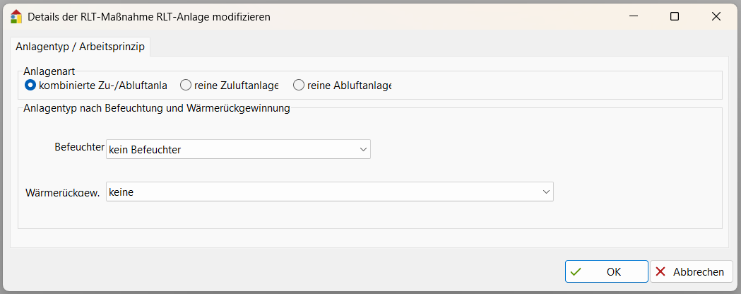 Anlagenart: Hier können Sie zwischen Zu-/Abluft, reiner Zuluft- und reiner Abluftanlage wählen.