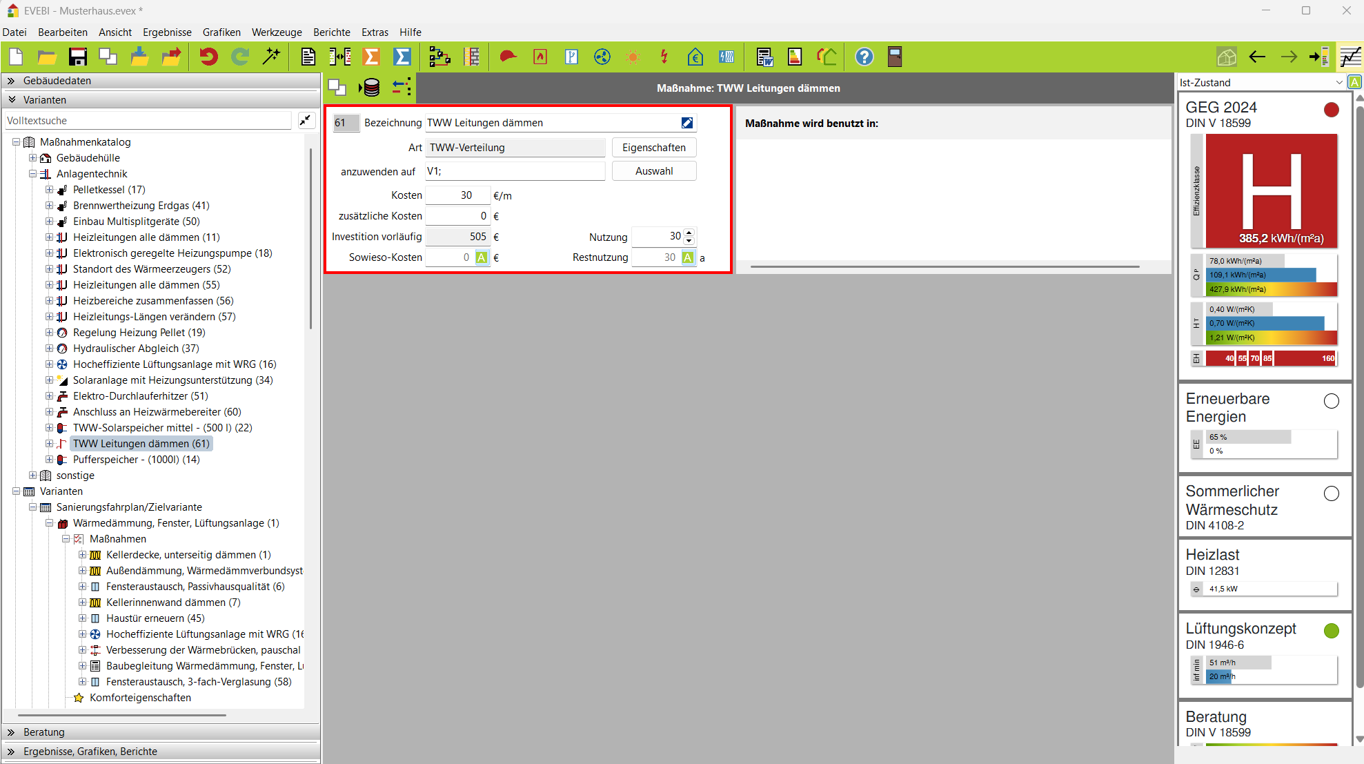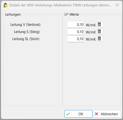 Werden Felder mit 0 belegt, so wird der Dämmstandard aus dem Ist-Zustand übernommen, d.h. keine Verbesserung dieser Leitungen.