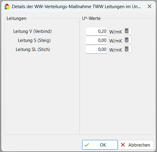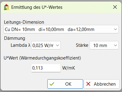 Die hier gewählten U-Werte sind nur für die ausgewählten Leitungen gültig. Ändern Sie hier bspw. den U-Wert für Anbindeleitungen und haben die Anbindeleitungen nicht in der Auswahl gewählt, so hat der hier angegebene U-Wert keine Auswirkung.