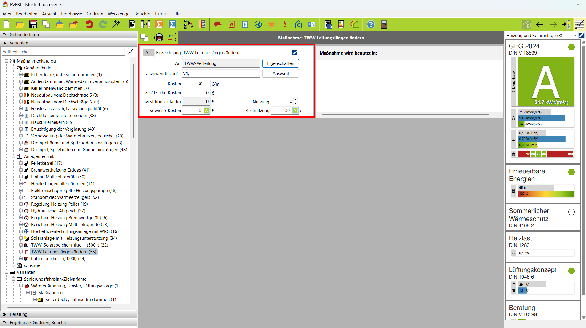 Dialog der Maßnahme TWW Leitungslängen ändern