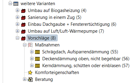 - Sie können jetzt die Maßnahmen der Variante bearbeiten. Das Bearbeiten der Maßnahmen wird empfohlen, um eine individuelle Beratung zu gewährleisten. siehe dazu unter: Maßnahmen bearbeiten.